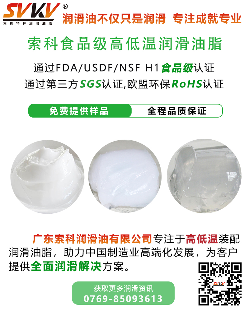 SVKV索科食品級全合成高低溫消音潤滑油脂選用食品級的基礎(chǔ)油和無毒無害的添加劑精制而成,專為食品加工和醫(yī)療設(shè)備而研制。SVKV索科食品級全合成高低溫靜音潤滑脂符合美國FDA和USDA法規(guī)和標(biāo)準(zhǔn),并通過美國USDA/NSF H-1食品級認(rèn)證,保障烤箱食品安全健康。