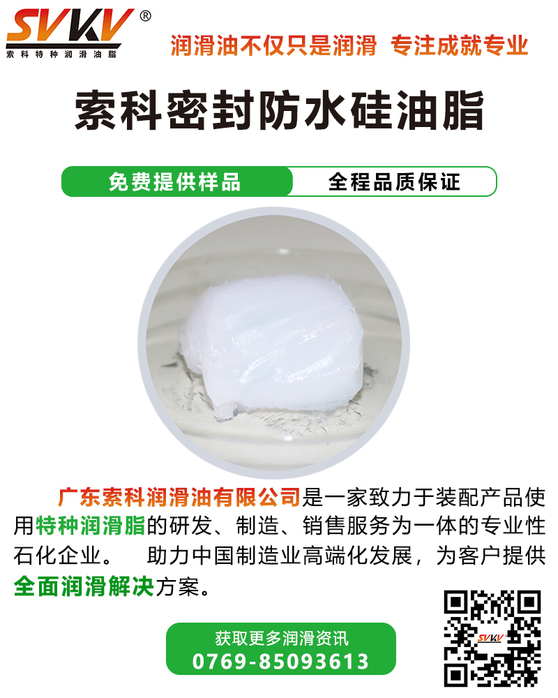 索科SVKV密封防水硅脂是由精煉合成油作為基礎(chǔ)油,并加有結(jié)構(gòu)穩(wěn)定劑、多種添加劑精制而成的特種油脂,具有良好的防水密封性,抗溶劑性和抗爬電性能,不腐蝕金屬,與橡膠具有較好的相容性。