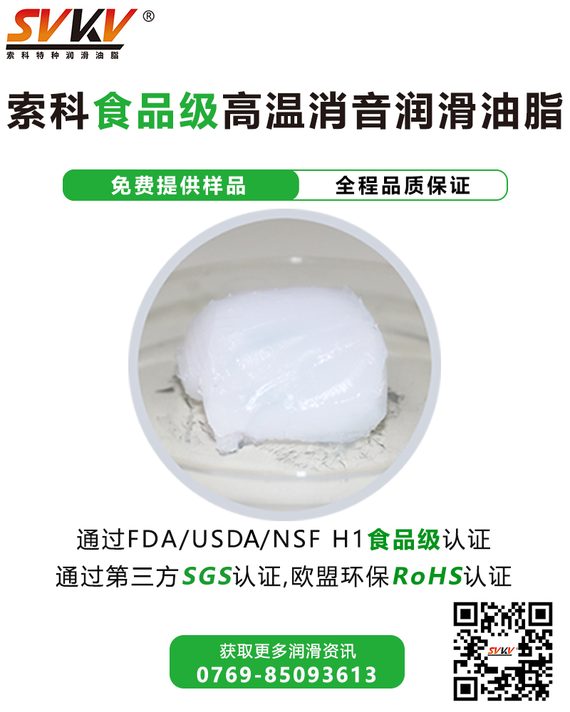 索科SVKV食品級(jí)高溫消音潤(rùn)滑油脂選用食品級(jí)的基礎(chǔ)油和無(wú)毒無(wú)害的添加劑精制而成,專為食品加工和醫(yī)療設(shè)備而研制。索科SVKV食品級(jí)高溫消音潤(rùn)滑油脂符合美國(guó)FDA和USDA法規(guī)和標(biāo)準(zhǔn),并通過美國(guó)NSF H-1食品級(jí)認(rèn)證,保障烤箱食品安全健康。