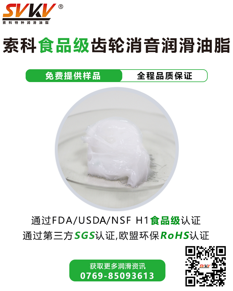索科SVKV食品級齒輪消音潤滑油脂選用食品級的基礎油和無毒無害的添加劑精制而成,專為食品加工及醫(yī)療設備而研制。索科SVKV食品級齒輪消音潤滑油脂符合美國FDA和USDA的法規(guī)和標準,并通過美國NSF H-1食品級認證,確保食品設備的衛(wèi)生、安全。