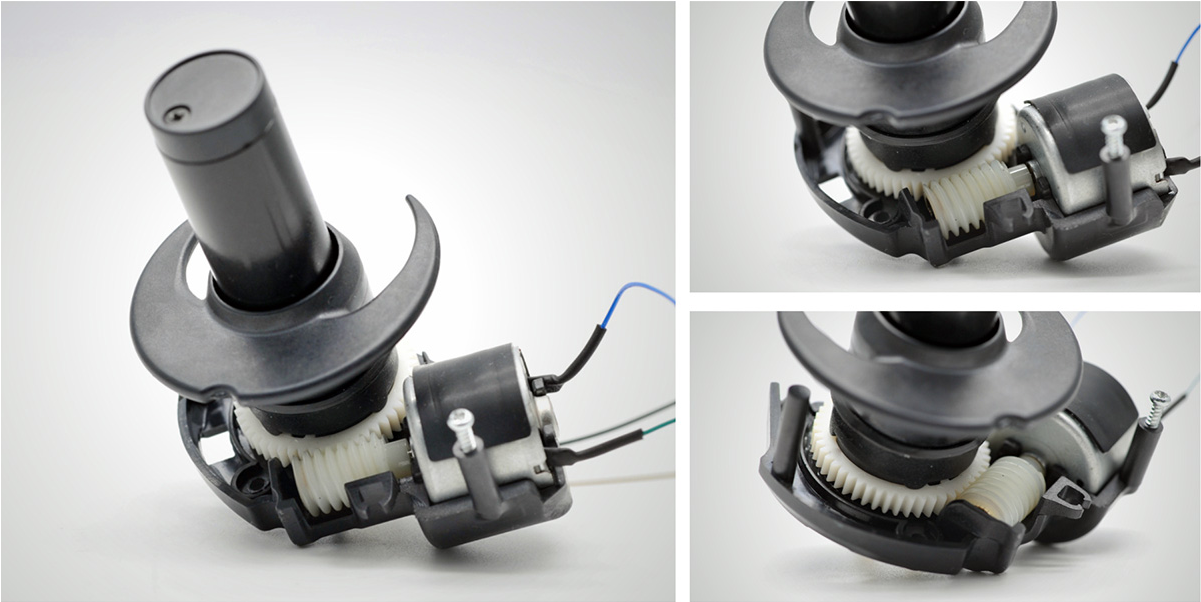 渦輪蝸桿齒輪箱可以有效的自鎖,通過渦輪蝸桿的螺旋角自鎖設(shè)計(jì)防止頭發(fā)旋轉(zhuǎn)卷曲后達(dá)到一定力矩后旋轉(zhuǎn)機(jī)構(gòu)的回轉(zhuǎn)。