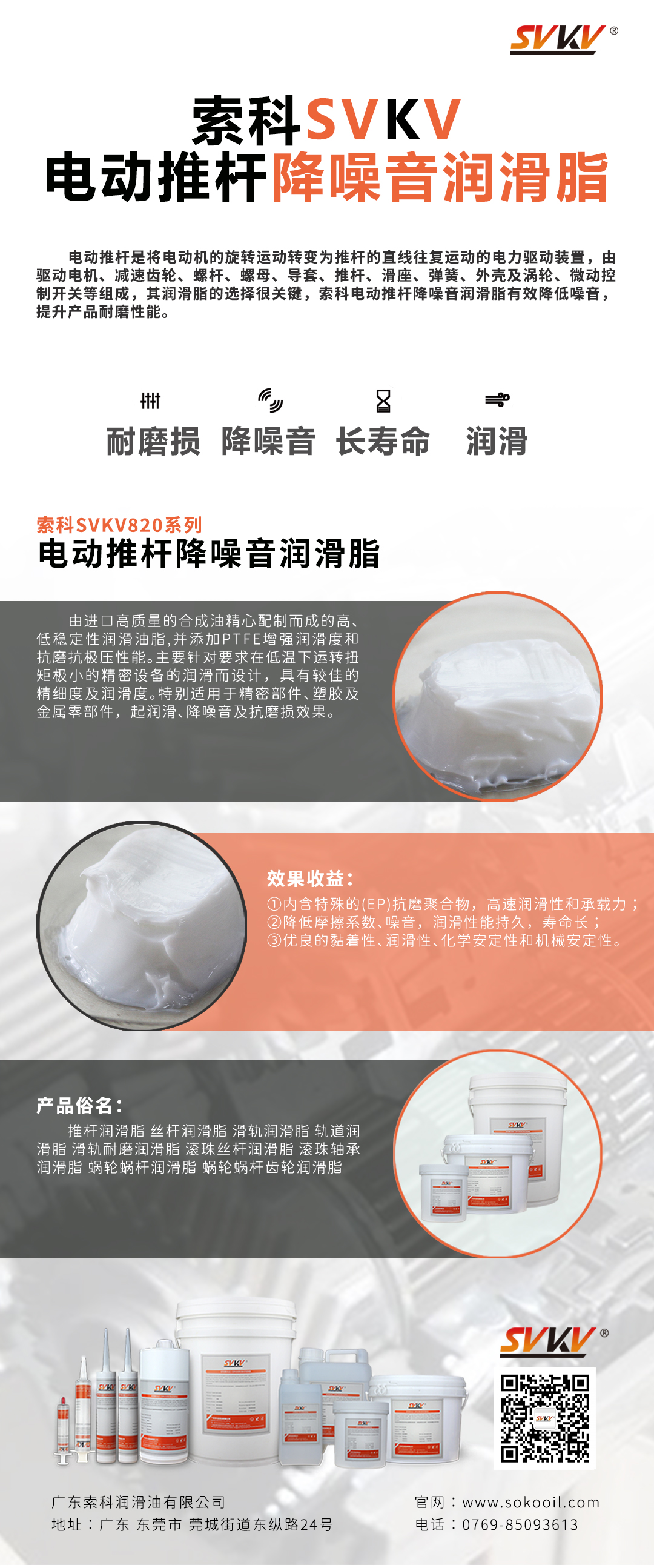 索科為企業(yè)提供潤滑方案,降本增效,適合的潤滑脂能有效減少磨損,降低噪音,延長產(chǎn)品壽命。索科提供電動推桿降噪音潤滑脂0769-85093613免費樣品,全程品質(zhì)保證!